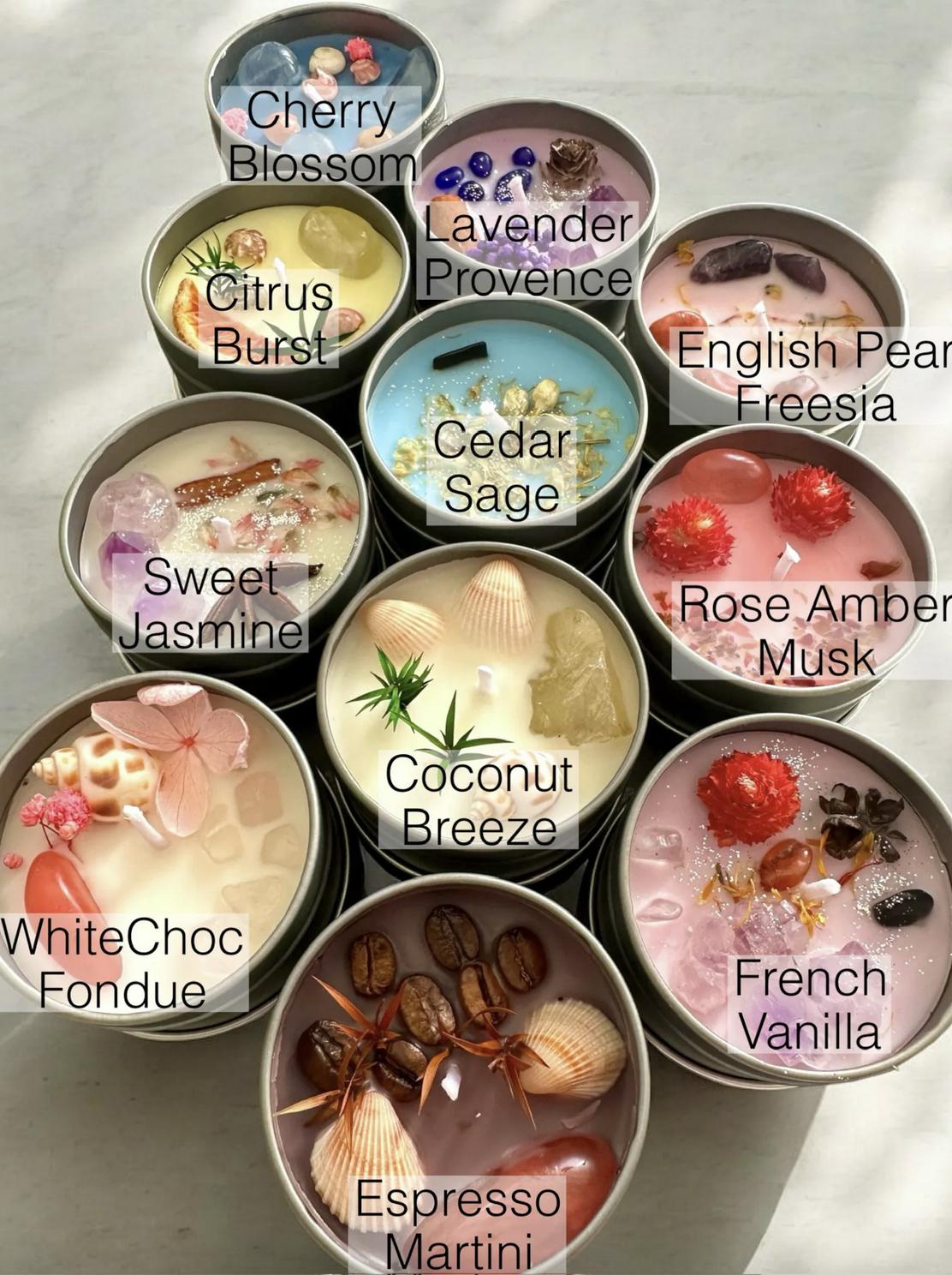 1x Soy Candle in Tin with Crystals & Flowers – Choose from available options.