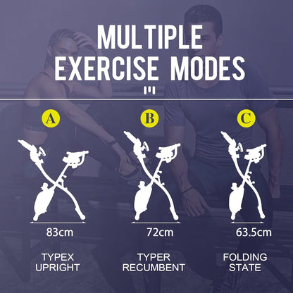 Experience the versatility of the FlexiRide Folding Exercise Bike, designed for both high-intensity workouts and gentle exercises. With options for upright and recumbent positions, this bike comes with resistance bands for an upper-body workout, making it perfect for men, women, and the elderly. Built to support up to 120 kg, it's your go-to fitness companion for safe and effective workouts.