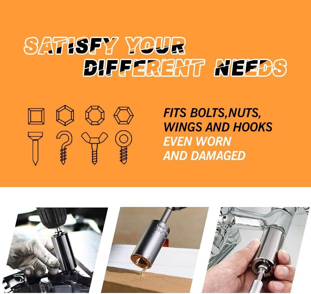 • SPECIAL DESIGN& WIDE APPLICATION: Self adjusting from standard 1/4in to 3/4in and metric 7mm to 19mm with over 125lbs of torque. Coordinate and adapt to ratchet Wrench and power drill to unscrew most bolts, nut, hooks, and other odd shape fasteners that you don't have the right tool for. Fits for auto repair, home maintenance, manufacturing, construction, etc, also favored by home decoration DIY design enthusiasts to support the work.