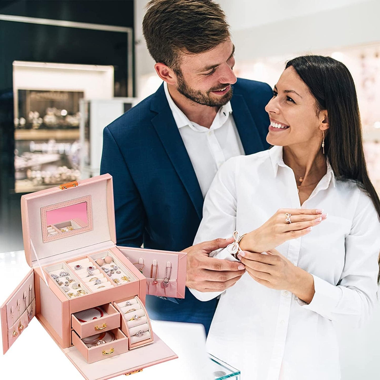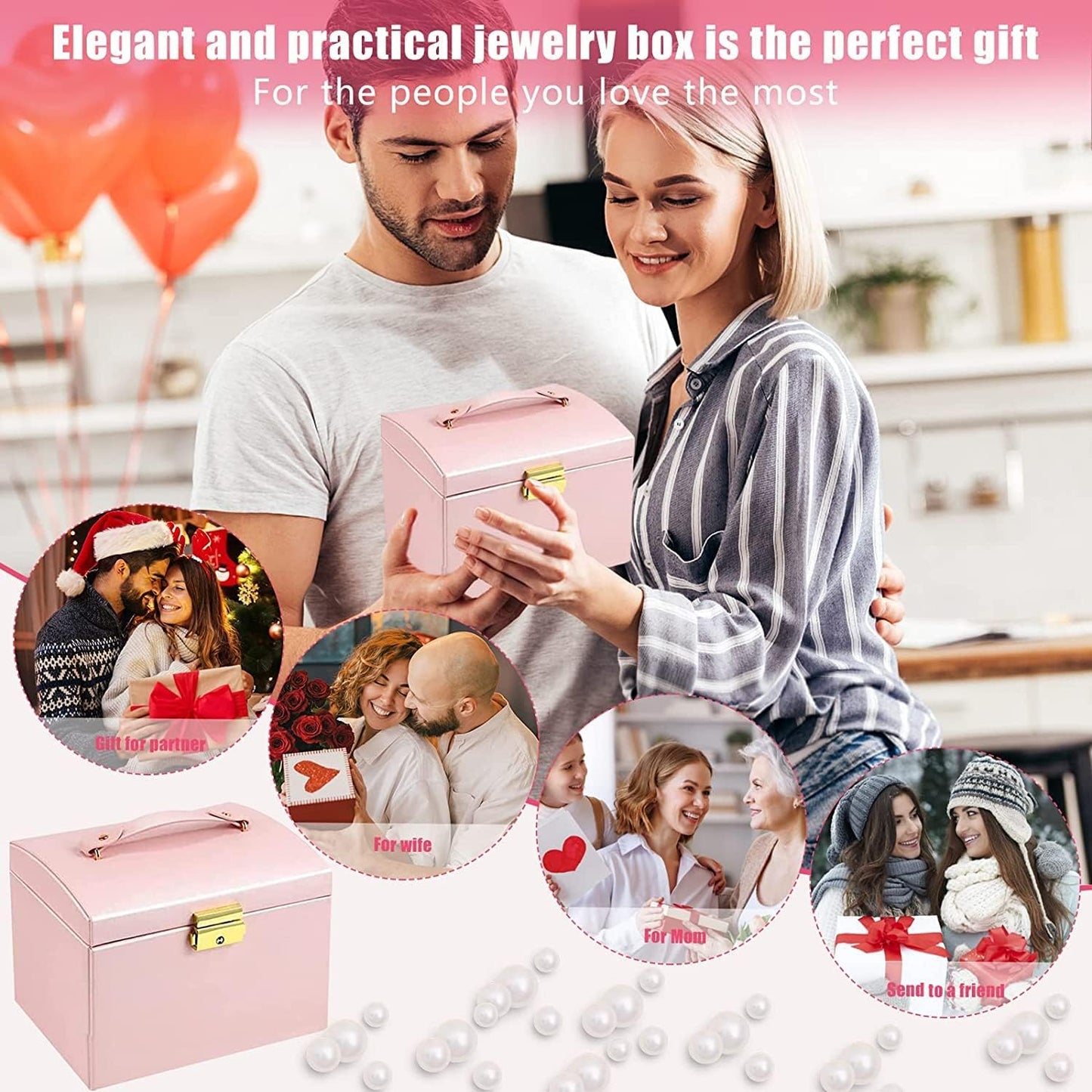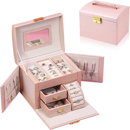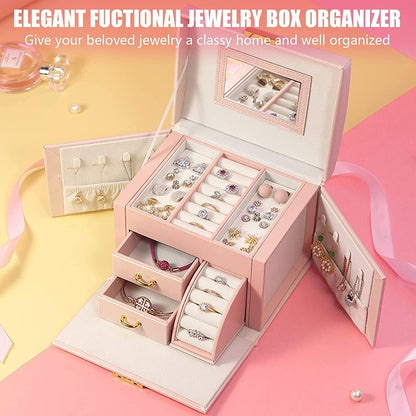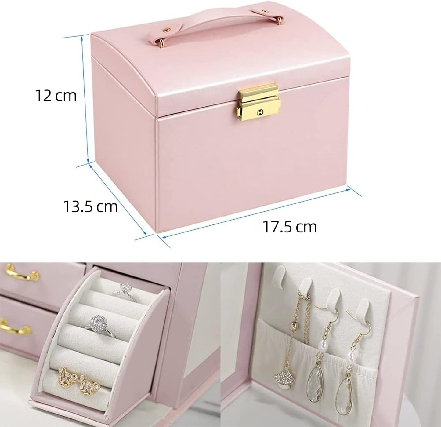 Jewelry Organizer Box Large-capacity Storage 3 Layer with Mirror and Lockable for Her Earrings Rings Bracelet Necklaces Girl and Woman Anniversary Mother's Day Valentines Gifts, TOJUNE (Pink)