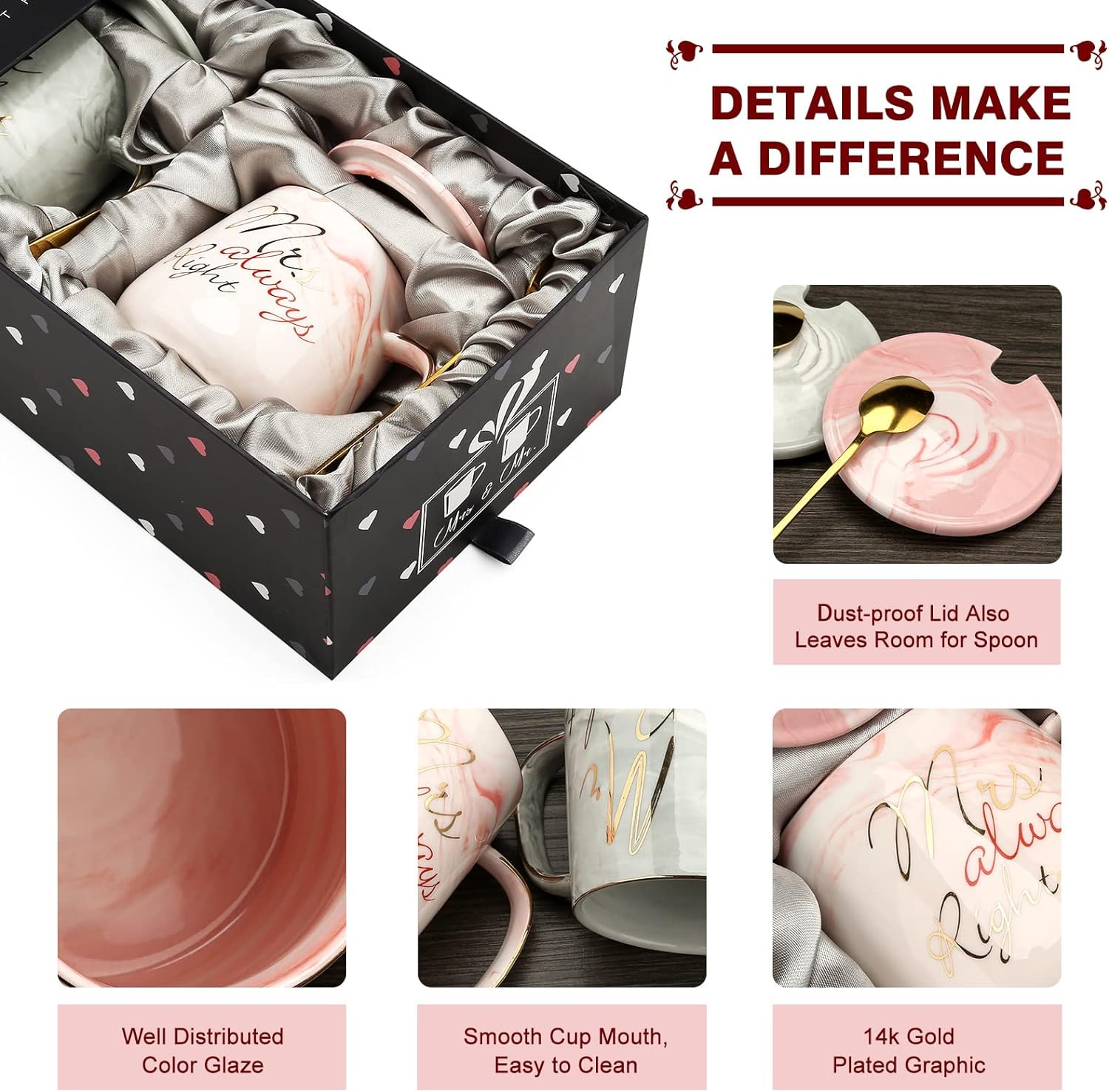 • ❤️ Include : 1 x 13 oz Mr Right Mug(Grey), 1 x 13 oz Mrs Always Right Mug(Pink), 2 x Cup lid, 2 x Spoons, 1 x Gift Box. Meet Your Further Coffee Drinking Need or Gift Giving Need!