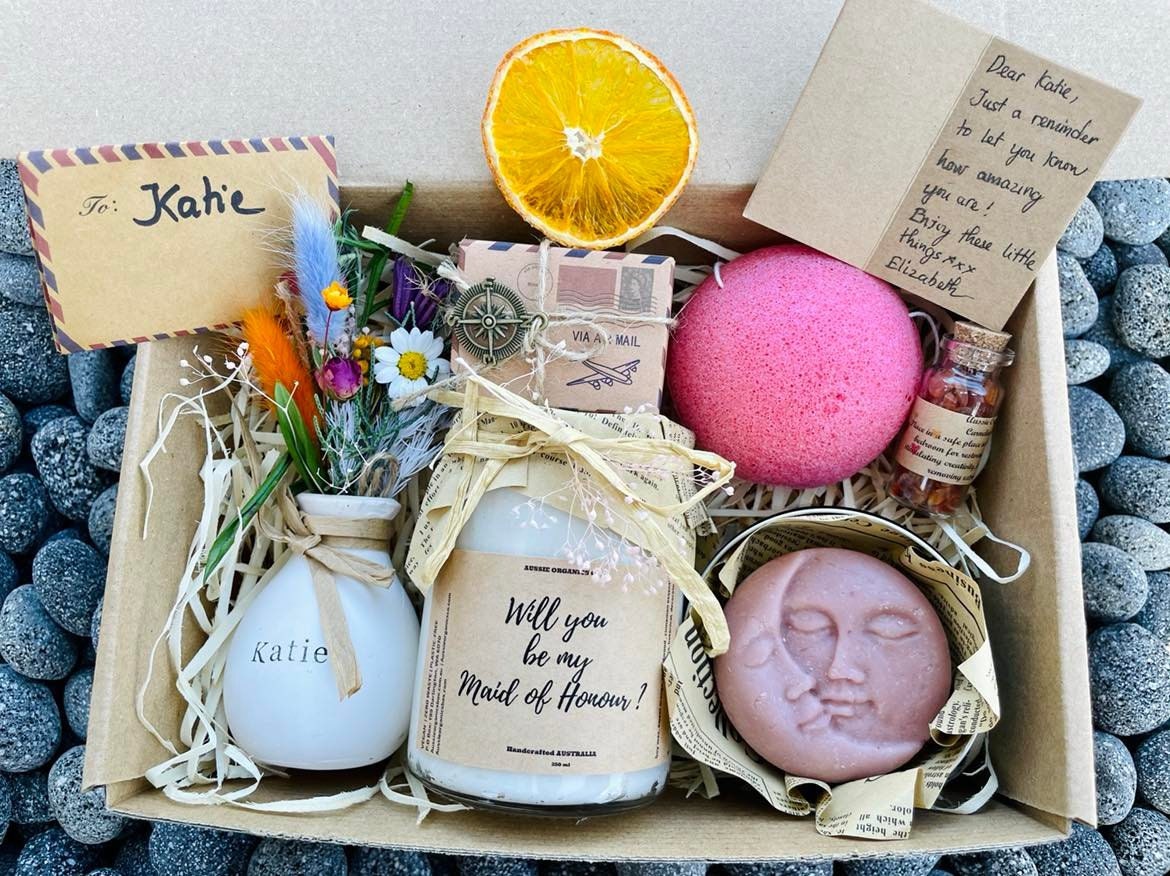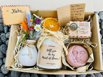 This maid of honour proposal self care gift box is personalised, organic, natural, vegan, zero- waste, plastic-free and toxin-free. Make your maid of honour feel special because this gift box is specially made for her with her own name on ceramic flower vase handmade by us, a bridesmaid proposal on the candle and all other organic and natural self care products.