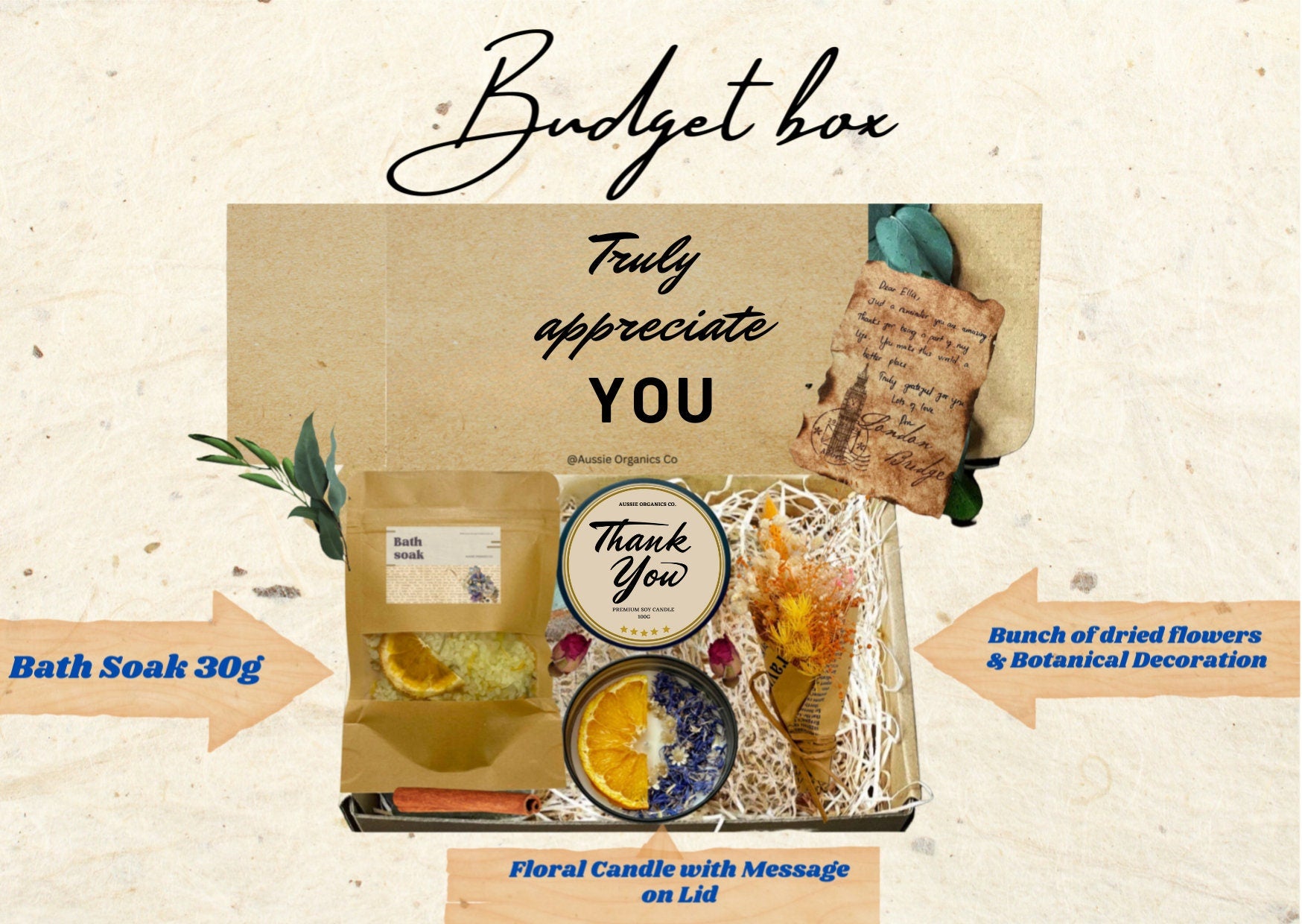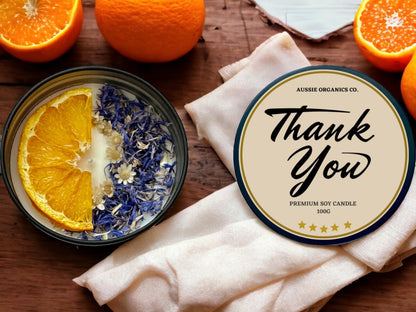 Hand poured 100% pure soy candle, scented with essential oils only, decorated with Australian flowers. Australian Orange dehydrated directly from our lab. Our soy floral candle not only emits a beautiful scent but also carries a heartfelt " THANK YOU" message on the lid.
