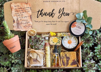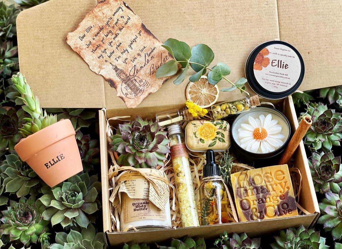 WHOLE BOX (10 items): THANK YOU, BEAUTIFUL 1 x Real succulent with personalised terracotta pot Succulent from our farm with personalised name on a terracotta pot 1 x Personalised chamomile candle 100g Non- toxic candle with personalised name on candle lid, made from soy wax, sweet orange essential oil and other natural ingredients 1 x Botanical body oil 50ml 100% natural, scent with essential oil, WA botanicals and crystal for positive energy 1 x Organic body butter 120ml Made from certified organic shea butter, oils and essential oils to soften skin and keep skin supple & smooth. 1 x Chamomile Bath Soak 30ml Made from 100% organic chamomile, Australian bath salt & essential oils 1 x Natural soap 100g Made from 100% natural ingredients with rosemary, orange & clove scent. 1 x Solid perfume in a vintage tin 30g Bring history back with solid perfume in a vintage tin, 100% natural ingredients with Sweet Orange, Atlas Cedarwood, Frangipani scent for meditation 1 x Wishing bottle Your wishes to someone in one or two words 1 x Organic rare chamomile bottle 10ml 1 x Short message on top of the box and/ or a handwritten message on a vintage card. Decorated with our orange slice, cinnamon stick & Australian native botanical harvested directly from our farm.