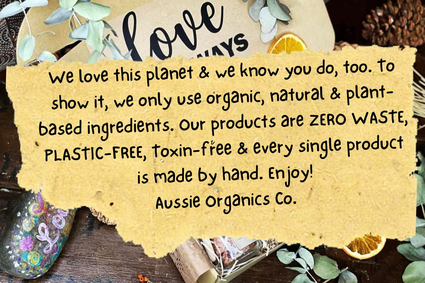 AUSSIE ORGANICS CO. * Organic * Natural * Vegan * Animal Cruelty- free * Zero waste * Plastic-free * Toxin-free * Handmade with love from Australia