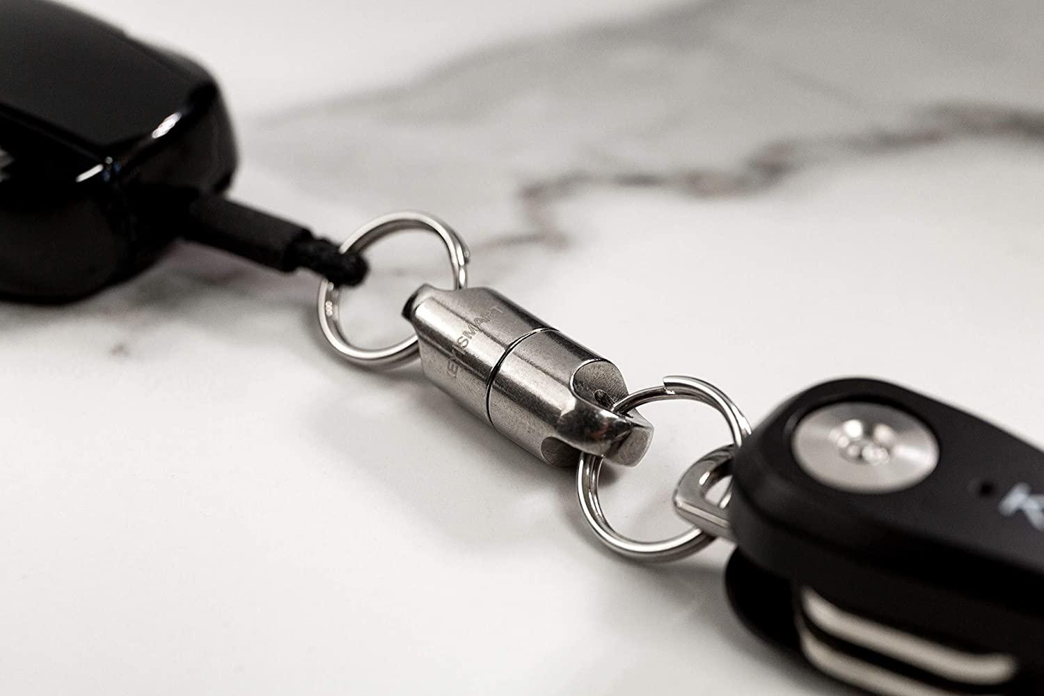 • QUICK AND EASY INSTALLATION: Attach one loop to your bag, purse, or backpack and attach the other loop to your keys like a standard keyring - then connect the two magnets to meet in the middle, this is overall an effective magnetic keychain with quick release key ring mechanism