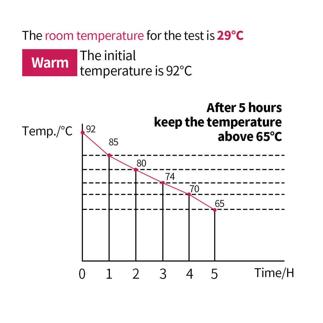 • The insulated temperature for 12 hours is 93C which will slowly decrease to 35C, especially in high-temperature degrees that only last for a few hours. Using indoors is highly recommended. The insulator cannot keep the liquid at a stable temperature. Its role is only to slow down the rate of temperature drop. This product isn't ideal to be used outdoor as it doesn't sustain the high temperature.