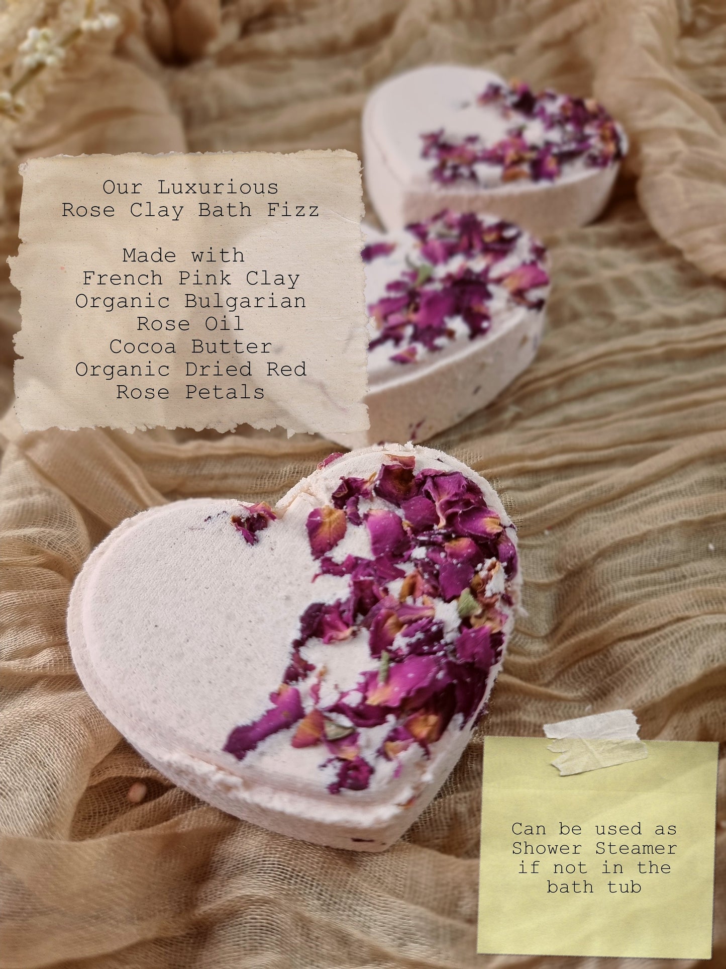 1x Rose Clay Bath Fizz Bicarb Soda, Citric Acid, Pink French Clay, Organic Cocoa Butter, Organic Rose Oil, Organic Dried Red Rose Petal