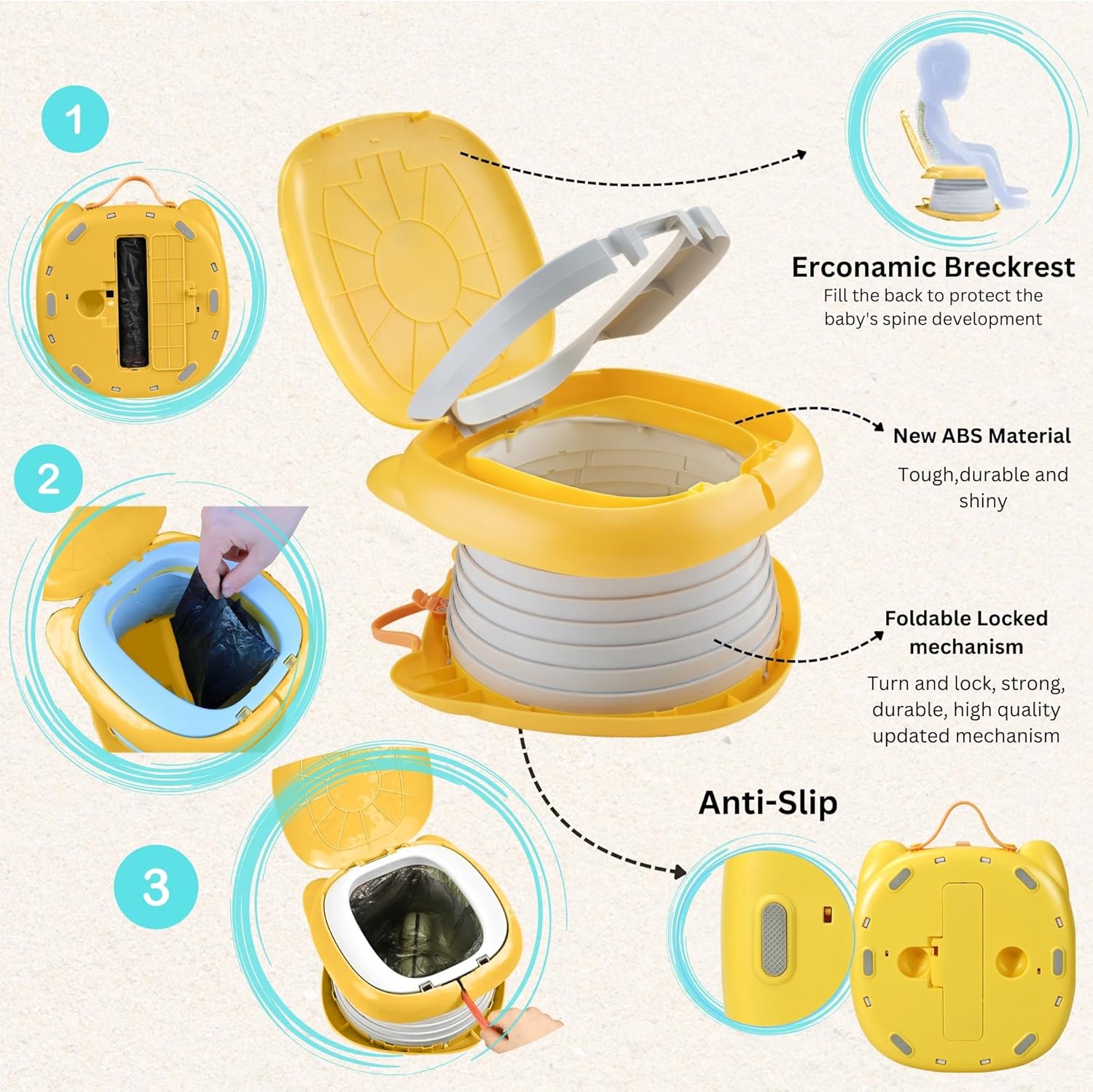 • 【High Quality】Our travel potty for toddlers, made of non-toxic ABS material, ensures safety with a 50 lbs (22kg) capacity. The foldable mechanism, tested for quality, is durable. Non-slip feet on the carry potty for toddlers provide security.