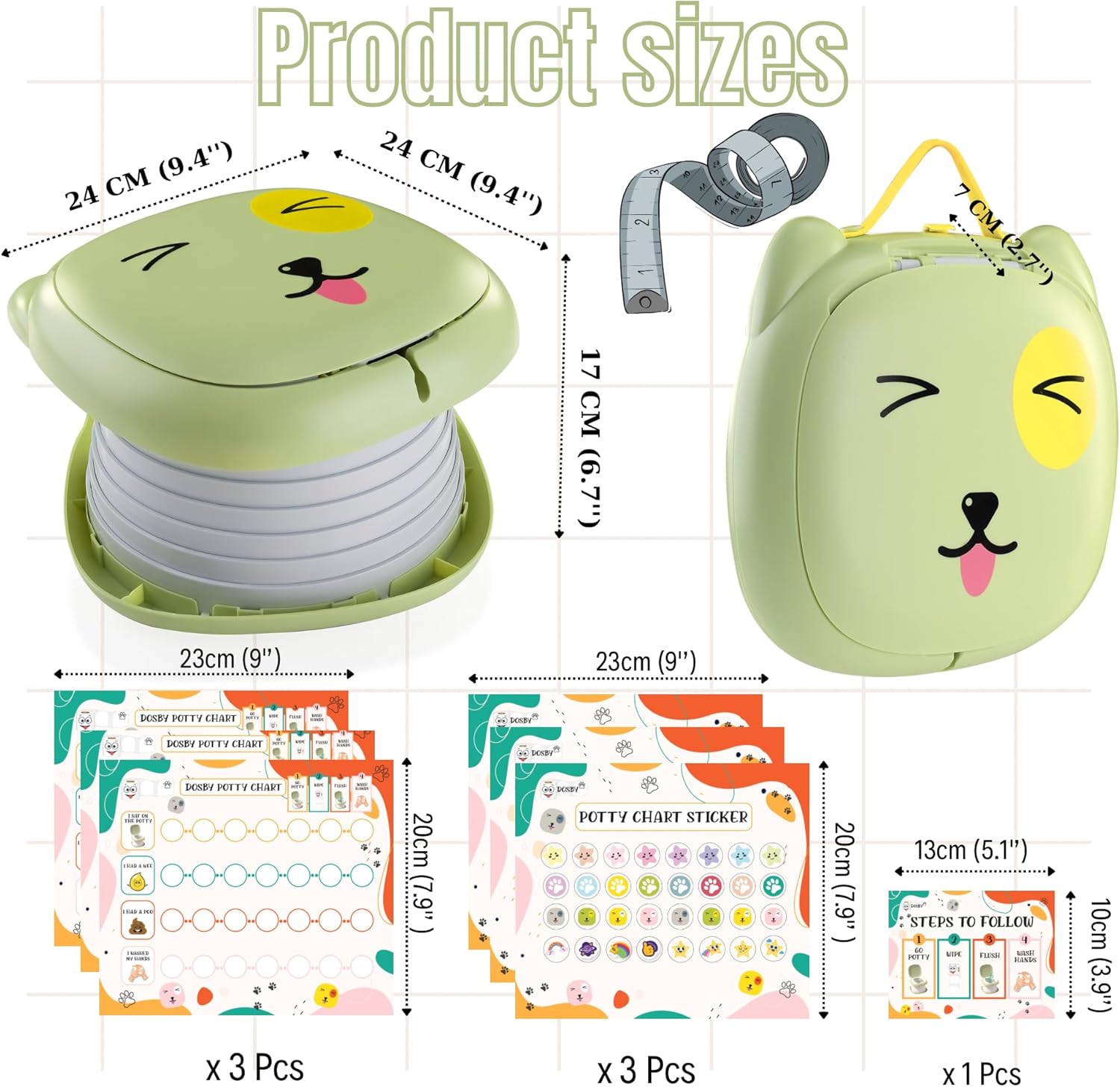 • 【Package Included】: You'll get a foldable carry potty for toddlers, 1 roll of disposable trash bags, 1 set of potty training reward chart and a drawstring storage bag.The foldable toilet measures 9.4"(24cm) x 2"(5cm) folded and 9.4"(24cm) x 6.6"(17cm) unfolded and can be easily folded in a backpack or carried by a child.