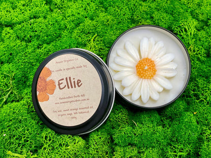 Non- toxic candle with personalised name on candle lid, made from soy wax, sweet orange essential oil and other natural ingredients