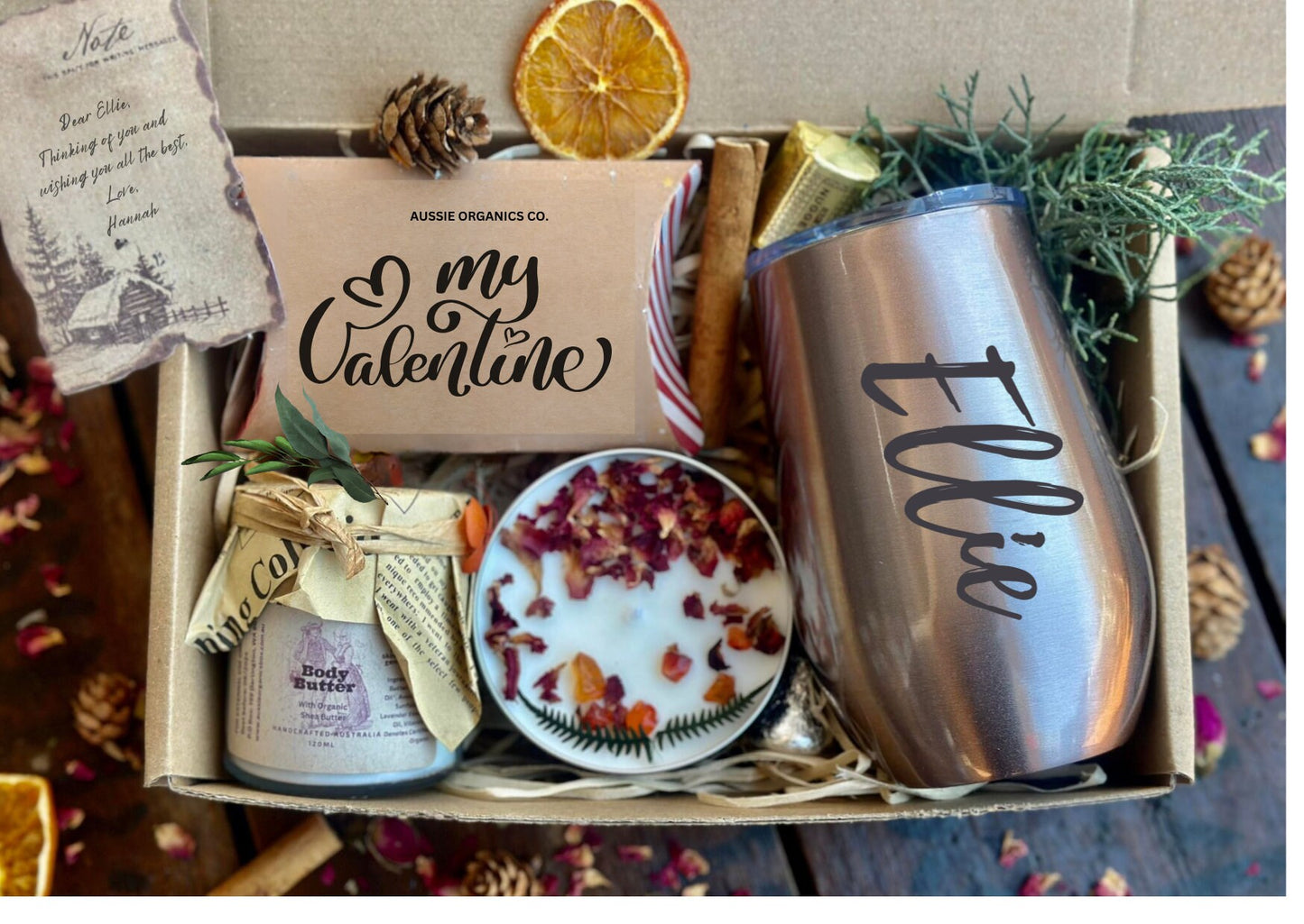Gift giving has never been easier! This personalized Valentine tumbler gift box is filled with handpicked, organic, and natural self-care products that promote relaxation and well-being.